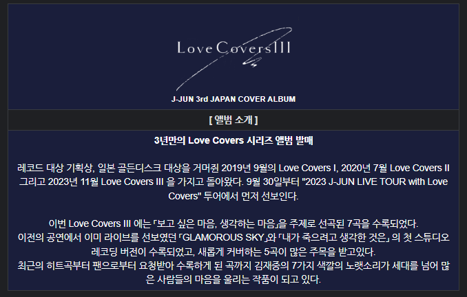 ✅ 이 'Love Covers' 시리즈는 김재중이 2019년부터 소개한 커버 앨범 시리즈로, 'Love Covers I'은 과거에 일본 레코드 대상과 일본 골든디스크 대상에서 '베스트 3 앨범(아시아 부문)'을 수상하는 등 큰 사랑을 받은 작품입니다.