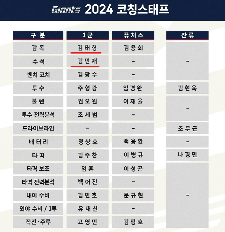 ✅ 김태형 감독과 새로운 출발을 앞둔 롯데 자이언츠가 2024시즌 코칭스태프 보직을 확정했습니다. 25일 롯데 구단의 발표에 따르면 '김태형호'의 수석코치는 김민재 코치가 맡게 됩니다. 벤치코치에 김광수 코치, 투수코치에 주형광 코치, 불펜코치에 권오원 코치가 임명됐습니다. 아울러 타격코치 자리에는 김주찬 코치가, 타격 보조코치에는 임훈 코치가 앉기로 했습니다. 내야 수비코치로는 김민호 코치, 외야 수비코치에는 유재신 코치, 작전 및 주루코치에는 고영민 코치, 배터리코치에는 정상호 코치가 역할을 수행합니다.