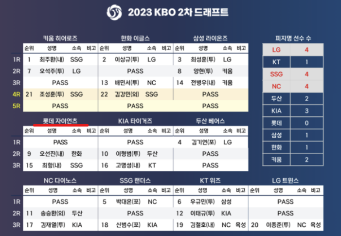 ✅ 이번 2차 드래프트에서 롯데는 한화의 오선진과 SSG의 최항 선수를 영입했습니다. 1라운드는 PASS 하였고 2라운드, 3라운드 각각 오선진, 최항을 지명하였습니다. 하지만 롯데 선수들 중에 다른 구단에 지명당한 선수는 한명도 없었습니다.