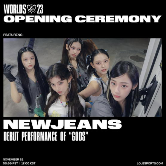 ✅ 뉴진스는 결승전의 시작을 알리는 오프닝 무대에 올라 '2023 LoL 월드 챔피언십' 주제곡 'GODS'의 퍼포먼스를 최초 공개합니다. 'GODS'는 웅장한 사운드에 뉴진스의 파워풀한 보컬이 어우러진 'LoL 월드 챔피언십' 열 번째 주제곡입니다.