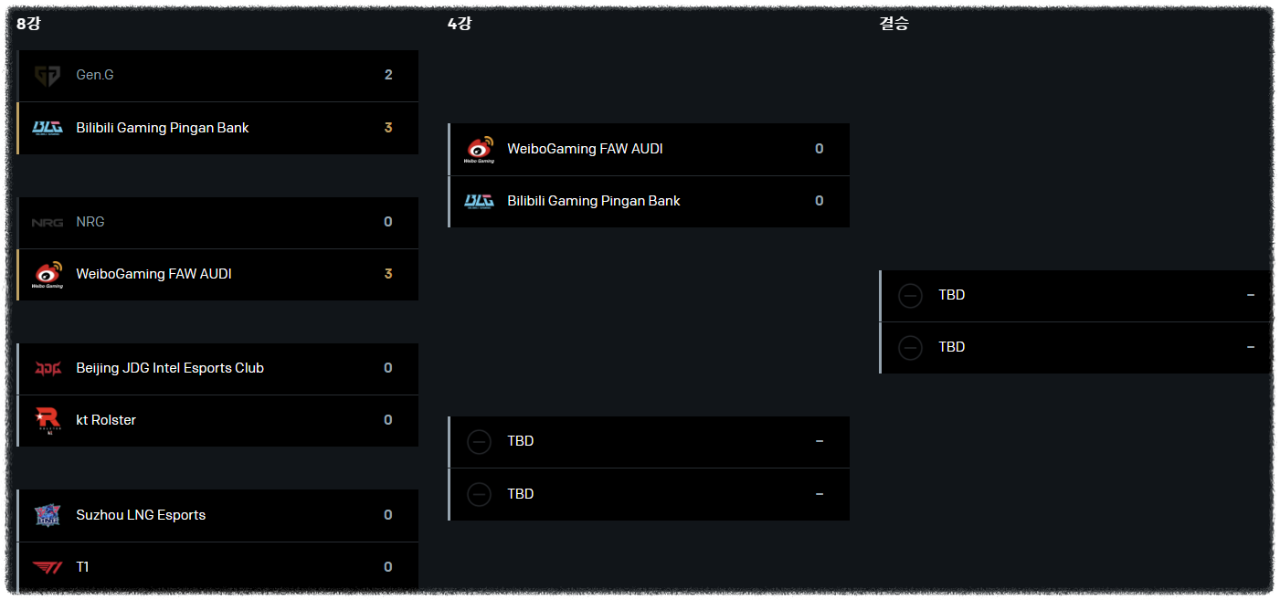✅ 현재 4강 진출을 위한 8강전이 펼쳐지고 있습니다. 며칠전에 젠지가 BLG에서 2:3으로 패배하면서 4강 1경기의 대진은 완성되었습니다.