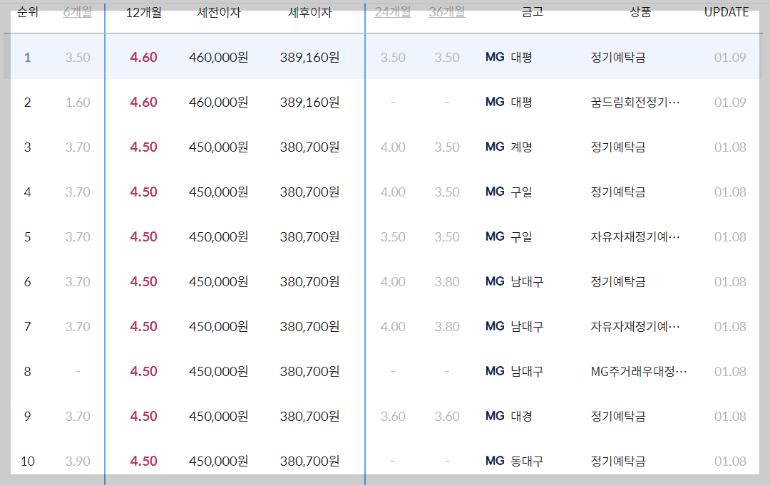 12개월 예치로 비교했을 경우에 대구에서 가장 높은 금리는 4.60%입니다. 또한 지점을 확인해보면 MG 대평입니다. 그리고 MG 계명과 MG 구일이 4.50%로 두번째로 높은 금리를 보이고 있습니다.