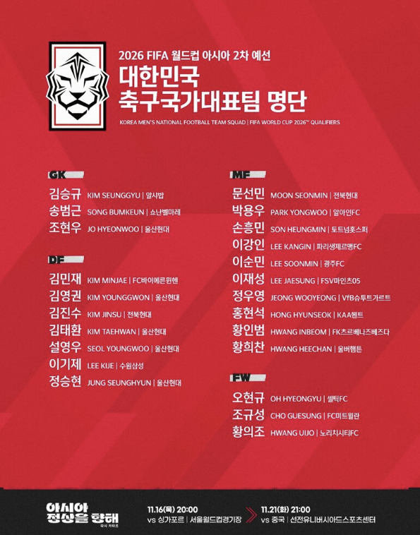 2026년 북중미월드컵 아시아지역 2차 예선 경기 1차전, 한국 VS 싱가폴이 11월 16일 펼쳐질 예정입니다. 또한 수능을 보는 수험생들을 위한 응원 이벤트로 무료 티켓 증정 이벤트가 진행됩니다. 이