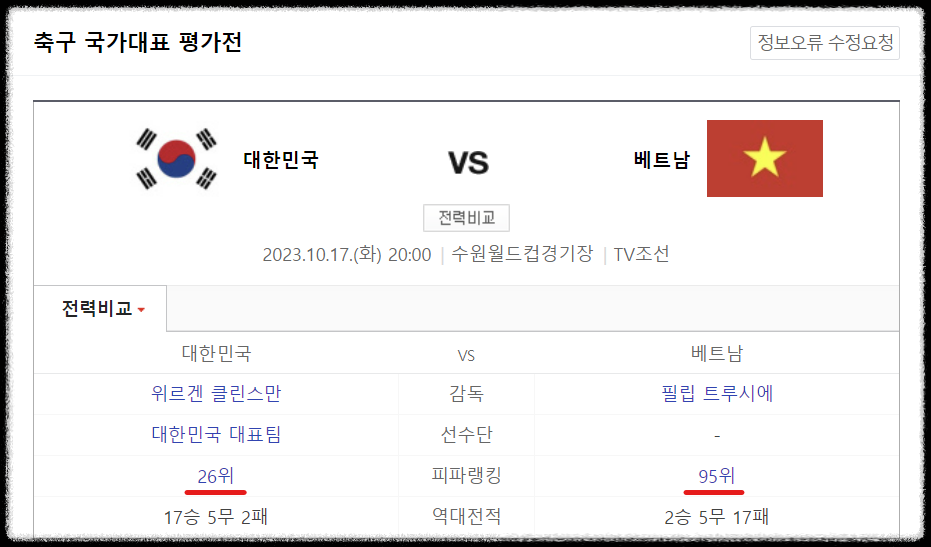 ✅ 대한민국 VS 베트남 : 10월 17일 화요일 20시
