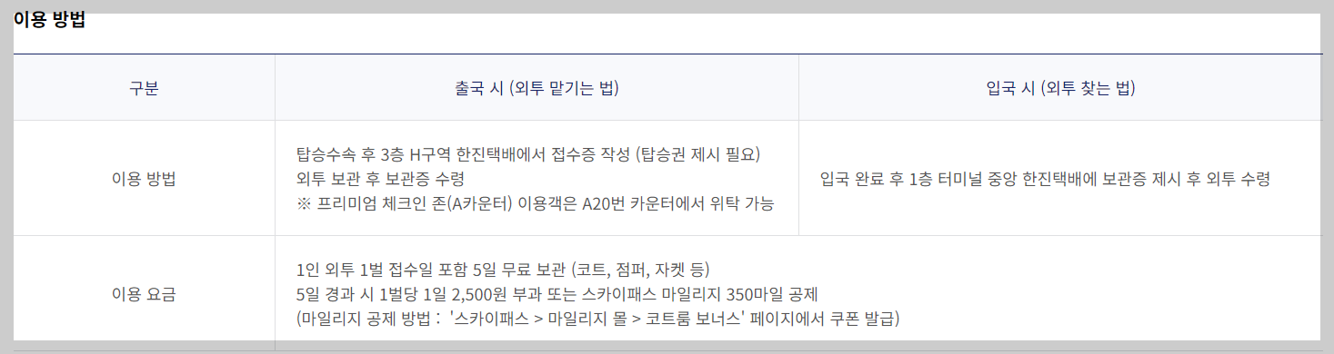 다만 A20 카운터는 오전 5시 30분부터 오후 8시까지 운영하므로, 카운터 운영 외 시간에는 한진택배 접수처 및 매장을 이용하면 됩니다. 추가 보관료 대신 대한항공 스카이패스 마일리지(1일 350마일)로 결제할 수도 있습니다. 대한항공 홈페이지나 모바일 앱에 접속하여 ‘마일리지 몰’을 통해 ‘코트룸 보너스’ 쿠폰 발급 후 코트 수령 시 모바일 쿠폰을 제시하면 됩니다.