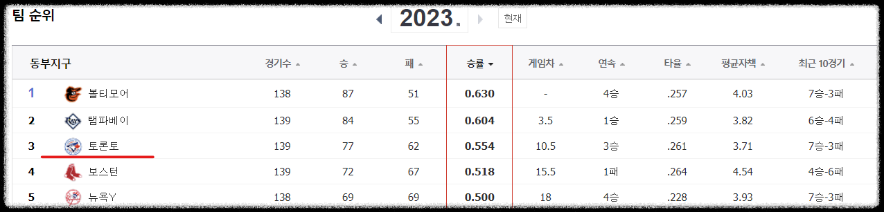 현재 토론토는 아메리칸리그 동부지구에서 볼티모어, 탬파베이에 이어 3등을 달리고 있습니다. 아무래도 동부지구에서 1등을 차지하는 것은 어렵기 때문에 와일드 카드를 노려야 하겠습니다. 아메리칸리그 와일드카드 순위는 동일하게 탬파베이와 시애틀 다음 3등이지만 시애틀과 차이가 거의 없기 때문에 남은 경기를 잘 치른다면 충분히 진출 가능할 것으로 보입니다. 앞으로 류현진의 경기 활약이 중요한 이유 중에 하나입니다.