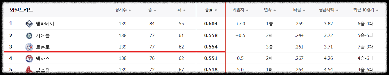 현재 토론토는 아메리칸리그 동부지구에서 볼티모어, 탬파베이에 이어 3등을 달리고 있습니다. 아무래도 동부지구에서 1등을 차지하는 것은 어렵기 때문에 와일드 카드를 노려야 하겠습니다. 아메리칸리그 와일드카드 순위는 동일하게 탬파베이와 시애틀 다음 3등이지만 시애틀과 차이가 거의 없기 때문에 남은 경기를 잘 치른다면 충분히 진출 가능할 것으로 보입니다. 앞으로 류현진의 경기 활약이 중요한 이유 중에 하나입니다.