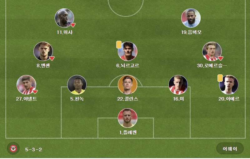 마르크 플레컨이 키퍼 장갑을 꼈고 비탈리 야넬트, 에단 핀녹, 네이선 콜린스, 벤 미, 마스 뢰르슬레우가 파이브백을 이뤘습니다. 마티아스 옌센, 크리스티안 뇌르고르, 비탈리 야넬트가 중원에 위치했고 브라이언 음뵈모, 요안 위사가 투톱으로 출전했습니다.