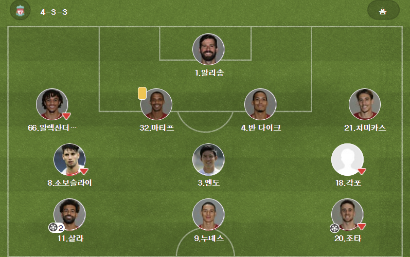 알리송 베케르가 골문을 지키고 트렌트 알렉산더아놀드, 조엘 마티프, 버질 반 다이크, 코스타스 치미카스가 포백을 이뤘습니다. 도미니크 소보슬라이, 엔도 와타루, 코디 각포가 중원을 책임지고 살라, 다르윈 누녜즈, 디오구 조타가 공격진으로 나섰습니다.