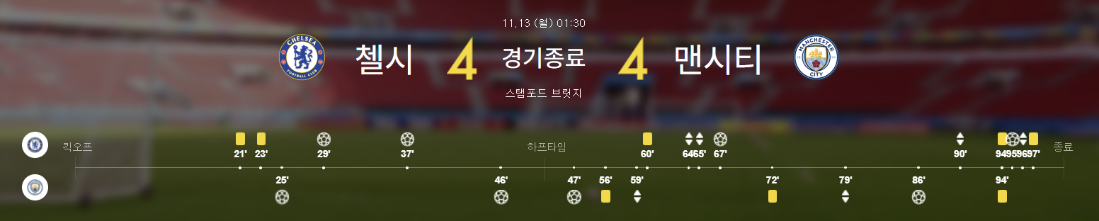 패색이 짙어지던 첼시는 디아스의 수비 실수로 동점 기회를 얻었습니다. 후반 추가시간 스털링의 크로스가 아르만도 브로야에게 연결됐고 브로야의 슈팅을 저지하려던 디아스의 태클이 그대로 박스 안에서 다리를 걸고넘어지며 주심이 곧바로 페널티킥을 선언했습니다. 키커로 나선 팔머가 정확하게 왼쪽 상단을 찌르며 득점에 성공했고 결국 두 팀은 8골이 터지는 난타전 끝에 4-4 무승부로 경기를 마무리했습니다.