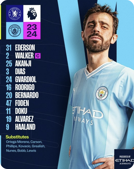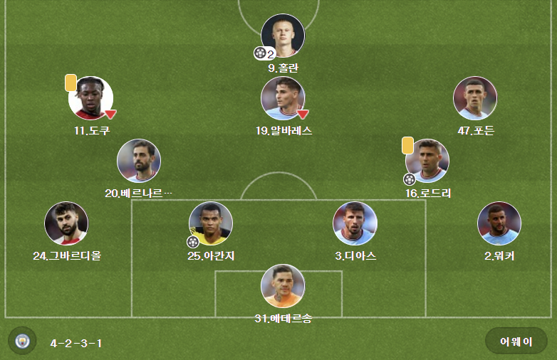 맨시티는 에데르송, 워커, 아칸지, 디아스, 그바르디올, 로드리, 실바, 포든, 도쿠, 알바레스, 홀란이 선발로 나섰습니다.