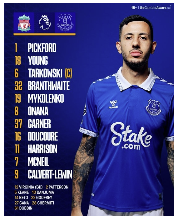 최전방에 칼버트르윈, 바로 뒤에 두쿠레, 허리에 맥닐, 오나나, 가너, 해리슨, 포백에 미콜렌코, 브랜스웨이트, 타르코우스키, 애쉴리 영, 골키퍼 픽포드가 나섰다. 대기 명단에 마이클 킨, 고프리, 게예, 단주마 등이 올랐다.
