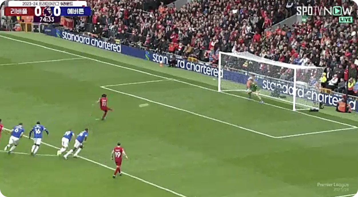 ➡️ 에버턴은 후반전 시작과 함께 마이클 킨과 패터슨을 조커로 투입하며 수비진을 강화해 버티겠다는 의지를 보였다. 수비를 더 걸어잠궈 실점을 막겠다는 의지로 에버턴은 5백 수비를 세웠다. 리버풀은 후반전 초반부터 에버턴을 상대 진영에 가둬두고 계속 두들겼다. 리버풀은 지속적으로 불운했고 후반 7분 살라의 왼발슛이 상대 타코우스키의 육탄방어에 가로막혔다. 에버턴은 수비 집중력이 빛났다.
