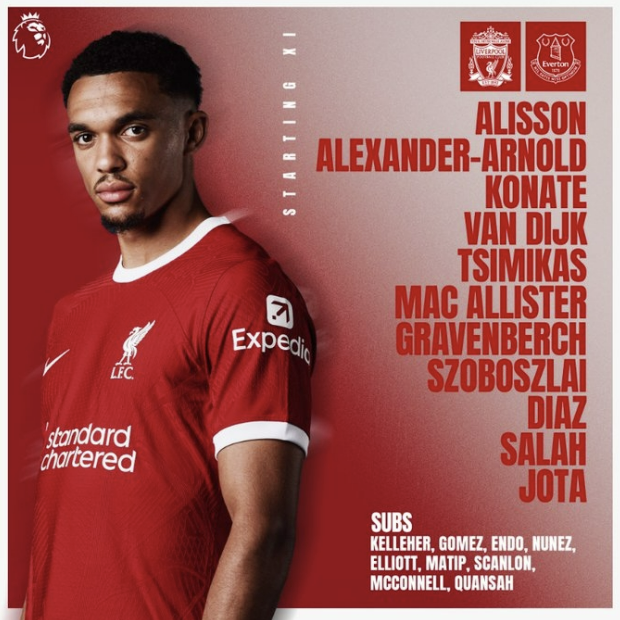 최전방에 디아스, 디오고 조타, 살라, 허리에 그라벤베르흐, 맥알리스터, 소보슬라이, 포백에 치미카스, 반다이크, 코나테, 알렉산더-아놀드, 골키퍼 알리송이 섰다. 벤치에는 고메스 마팁 엔도 누네스 등이 앉았다.