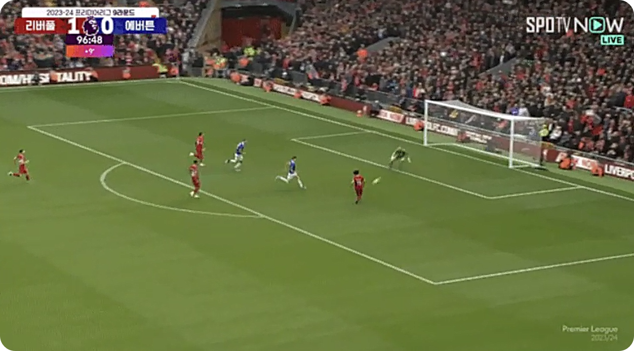➡️ 리버풀이 전반전 초반부터 공격을 주도하며 볼점유율을 높게 가져갔다. 에버턴은 최전방과 수비라인이 경기 초반부터 벌어졌다. 최전방은 라인을 올렸고 수비라인은 자기 진영에 두면서 중원이 벌어졌다. (에버턴이 강팀을 상대하는 방식)