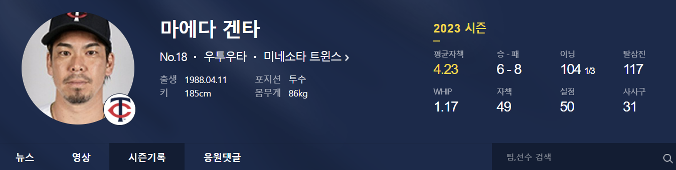 마에다는 2016년 다저스를 통해 빅리그에 입성한 뒤 그해 16승 11패 평균자책점 3.48의 성적을 올리며 MLB에 안착했습니다. 이후 2019년까지 안정적으로 다저스 선발 로테이션의 한축을 맡으며 전성기를 보냈으며 2020년 미네소타 트윈스로 이적한 뒤엔 팔꿈치 부상 등으로 다소 부진했습니다. 팔꿈치 인대 접합 수술을 받아 2022시즌은 통째로 날리기도 했습니다. 마에다는 2023시즌 복귀해 재기에 보란듯이 성공했고 21경기에서 6승 8패 평균자책점 4.23의 성적을 거둔 뒤 자유계약선수(FA) 자격을 얻었습니다. MLB닷컴은 "마에다는 2020년과 수술 여파로 한 해를 쉰 2022년을 제외하면 MLB 데뷔 후 한 시즌도 빠짐없이 100이닝 이상을 던졌다"라며 "여전히 경쟁력 있는 투수"라고 평가했습니다.
