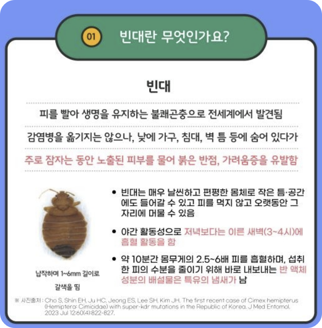 살충제 내성을 가진 '슈퍼 빈대' 공포가 전국적으로 확산하는 가운데 정부 등 국회에서는 여러가지 방역에 대한 노력을 기울이려고 하고 있습니다. 거기에 더해 우리 각자도 빈대에 대해 좀 더 정확한 정보를 가지고 예방, 퇴치 등에 관심을 기울여야겠습니다. 그래서 오늘은 빈대에 대해서 알아보고 퇴치법도 알아보도록 할테니 지금부터 집중하시면 좋겠습니다.