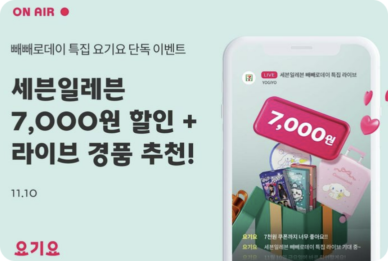 '빼빼로데이' 기념 라이브 커머스 방송은 이날 오후 6시부터 1시간 동안 요기요앱 내 '스토어 라이브' 방송을 통해 진행됩니다. '스토어 라이브'는 요기요앱 내 스토어 카테고리 브랜드의 상품을 실시간 방송을 통한 구매 후 1시간 이내로 배송해 줍니다. 이번 '빼빼로데이' 라이브 커머스 방송을 기념해 할인 행사도 진행하는데 방송 중 구매 고객이라면 누구나 2만 원 이상 주문 시 7000원이 자동으로 할인됩니다.