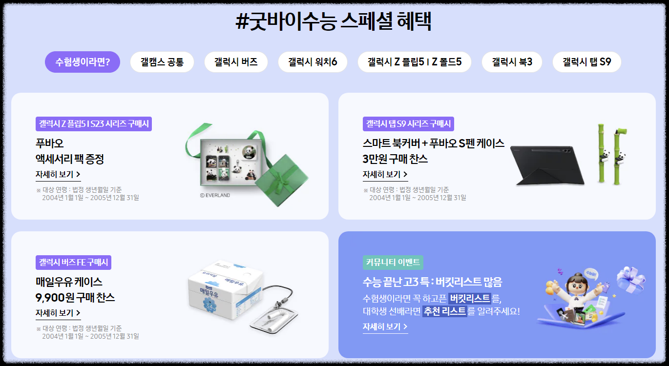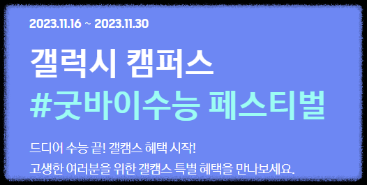 수험생과 대학생이라면 갤럭시 스마트폰, 갤럭시워치, 버즈, 갤럭시탭, 노트북 등을 특가로 구입할 수 있는 이벤트가 있습니다. 바로 굿바이 수능 페스티벌인데요, 갤럭시 캠퍼스 회원으로 가입해서 수험생 및 대학생, 대학원생 교육할인가로 구입이 가능합니다.
