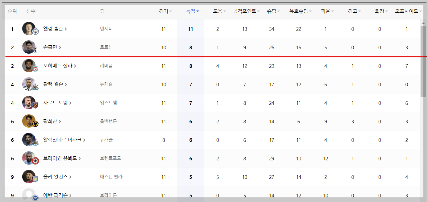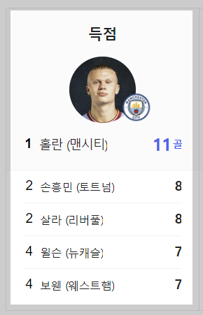 16/17 시즌부터 지금시즌까지 손흥민이 리그경기에서 10골을 넣었을때의 페이스를 확인해보았습니다. 득점왕을 차지했던 21/22 시즌때보다 훨씬 빠른 페이스를 가져가고 있습니다. 그리고 제일 10골을 빨리 넣었던 시즌은 20/21 시즌이었으나 최종적으로는 17골을 득점한 해였습니다. 득점왕 시즌보다 빠른 페이스를 보여주고 있으며 아직 11라운드 경기까지 마친 상태이기 때문에 이 폼을 그대로 유지한다면 득점왕 시즌의 23골 기록을 충분히 경신할 수도 있겠습니다. 어려울수도 있지만 득점 1위(득점왕)는 홀란과 살라와 선의의 경쟁을 펼쳐야겠습니다.