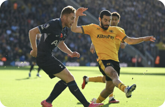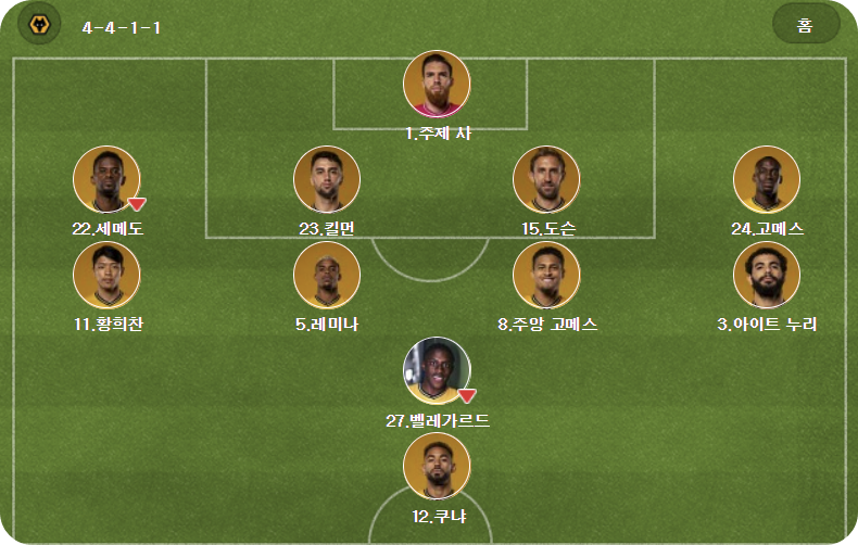 최전방은 마테우스 쿠냐가 출격합니다. 2선에선 장 리크너 벨가르드가 지원 사격하고 중원에는 라얀 아잇-누리, 주앙 고메스, 마리오 르미나, 황희찬이 포진했습니다. 4백은 토티 고메스, 크레이그 도슨, 막시밀리안 킬먼, 넬송 세메두가 출전하였고 골문은 조세 사가 지키게 됩니다.