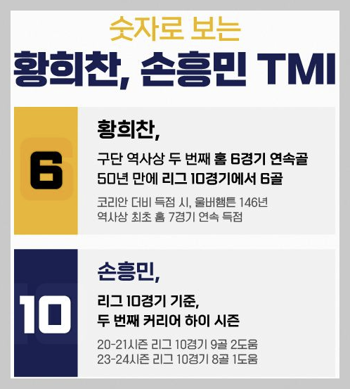 두 선수는 자랑스럽게 현재 팀 내에서 최다 득점을 올린 선수들입니다. 손흥민은 현재 리그 10경기 기준 커리어 하이 시즌을 보내고 있고 황희찬 역시 구단 역사상 두 번째로 홈 6경기 연속골 기록을 세웠습니다.