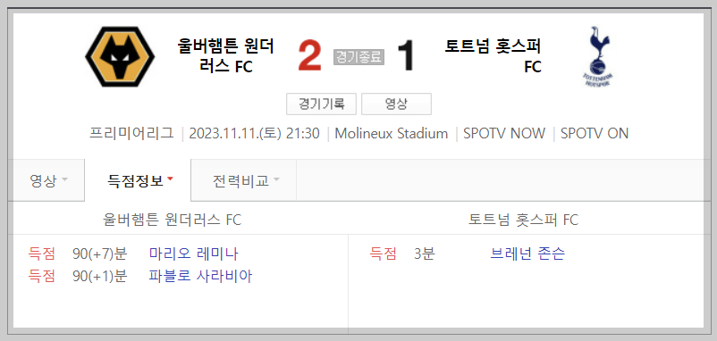 2. 경기 결과 : 2 대 1로 울버햄튼 역전승