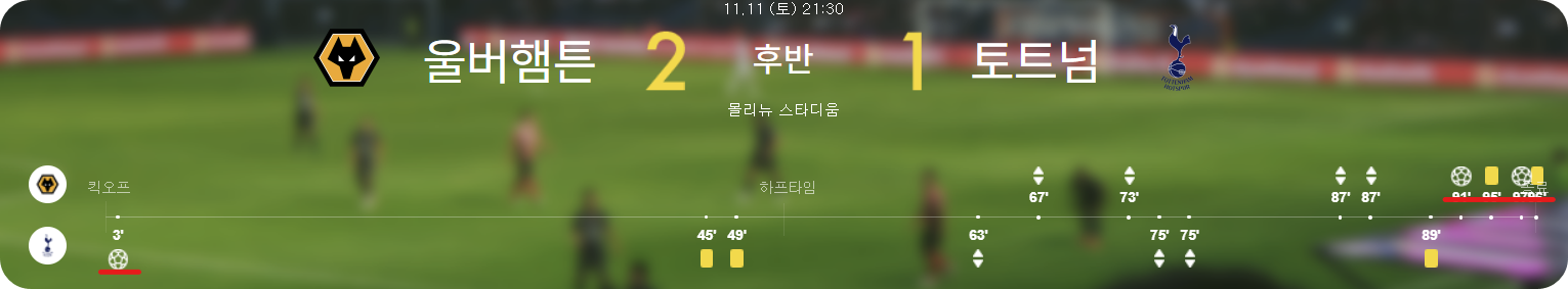 손흥민과 황희찬은 경기 종료직전까지 교체되지 않으며 엄청난 활동량을 보여주며 팀의 승리를 위해 뛰었습니다. 하지만 좀처럼 골과 관련된 좋은 장면을 만들지는 못하였습니다. 토트넘의 선취골로 이대로 종료되나 했으나 후반 45분에 마테우스 쿠냐의 어시스트에 이은 사라비아의 동점골로 분위기가 바뀌었습니다.