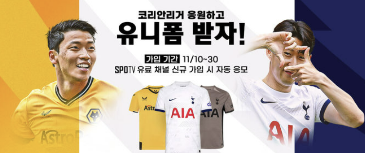 이번 이벤트는 오는 10일부터 30일까지 프리미어리그를 중계하는 스포티비 온(SPOTV ON) 상품에 신규 가입하는 고객 가운데 추첨을 통해 총 100명에게 토트넘과 울버햄튼의 유니폼을 증정합니다. 또 SK브로드밴드는 B tv의 여러 실시간 스포츠 채널을 이용하는 고객 중 스포티비 프라임 패키지에 가입하지 않은 고객을 대상으로 패키지 1개월 무료 사용 쿠폰 50만개를 제공한다고 합니다.