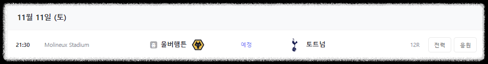 경기는 11월 11일, 밤 9시 반에 Molineux Stadium에서 시작됩니다. 현재 토트넘은 승점 26점으로 맨시티(27점)에 이어 리그 2위를 차지하고 있고 울버햄튼은 승점 12점으로 14위에 위치하고 있습니다.