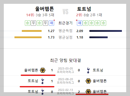 두 팀의 리그 전적 기록을 보면 토트넘이 9승 3무 6패로 우위에 있습니다. 하지만 최근 3경기로 양팀 맞대결 결과를 좁혀보니 울버햄튼이 토트넘에 2승 1패로 우위를 점하고 있습니다. 그리고 두 팀 다 최근 경기는 각각 패배를 기록하여 이번 라운드에서 승점을 확보하기 위해 각 팀 선수들이 사활을 걸 것이라 예상됩니다.