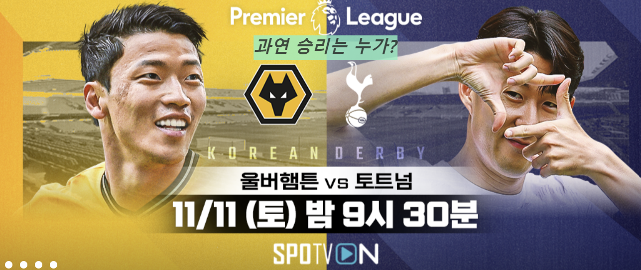 현재 프리미어리그에서 좋은 모습을 보여주고 있는 손흥민과 황희찬이 곧 격돌합니다. 11월 11일 프리미어리그 경기에서 토트넘과 울버햄튼이 맞붙게 되는데요~ 또 우리나라의 축구편들은 잠을