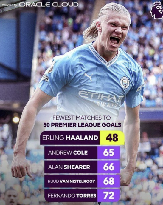✅ 경기 종료 이후 홀란이 스포트라이트를 받았습니다. 이유인 즉슨, PL 통산 48경기 만에 50번째 득점에 성공하며 'PL 역대 최단 경기 50호골'을 달성했기 때문입니다. 영국 공영방송 'BBC'는 "또 다른 날, 또 다른 경기, 또 다른 득점, 또 다른 홀란 기록. 홀란은 리버풀전 당시 득점으로 역대 가장 빠르게 PL 50호골을 터뜨린 선수가 됐다. 이전 기록 보유자 앤디 콜은 50골까지 65경기가 필요했으며 앨런 시어러는 66경기가 걸렸다"라고 감탄했습니다.