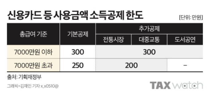 ➡️ 지난해까지는 연봉 7000만원 이하일 때 추가공제 한도는 도서공연, 전통시장, 대중교통 등 항목별 100만원씩으로 나뉘어 있었는데 올해부터는 세 항목을 통합해 300만원까지 추가공제