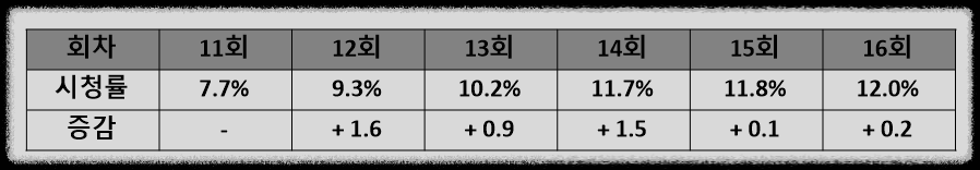 ➡️ 11회(파트2 첫회)는 7.7%로 다소 하락한 채 출발하였습니다. 하지만 12회 때 9.3%로 바로 상승하더니 13회 10.2%, 14회 11.7%, 15회 11.8%, 16회 12.0%로 지속적으로 상승하였습니다.