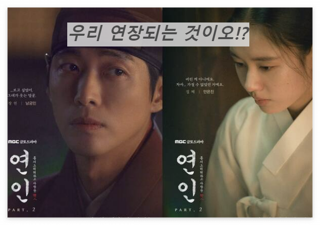 MBC 금, 토 드라마 연인은 최근 인기에 힙임어 과연 연장을 결정할까요? MBC 관계자는 아마도 오늘 중에 연장 여부에 대한 입장을 공식적으로 밝힐 예정이라고 합니다. 아직 입장이 나오지 않는 상황에서 시청자들은 애만 타들어가고 있다고 하네요. 한번 알아보도록 하겠습니다.