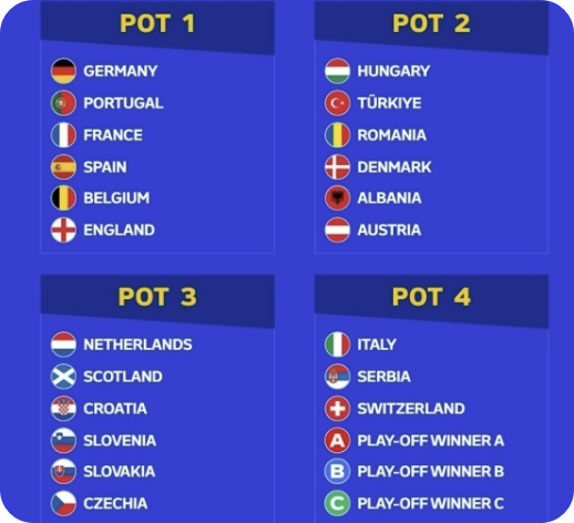 ✅ 유럽축구연맹(UEFA)은 24개 참가국을 4개 포트로 나눠 조추첨식을 진행합니다.