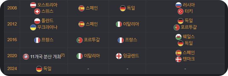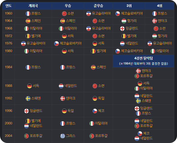 📌독일과 스페인이 각각 3번으로 가장 많이 우승했고 그 뒤를 이탈리아, 프랑스가 차지했습니다. 아쉽게 작년에 준우승을 거둔 잉그랜드는 한번도 우승한 적이 없습니다.