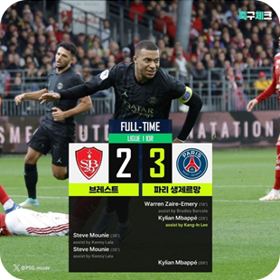 파리생제르망이 에머리와 음바페의 연속골로 2 대 0으로 앞어나가다 전반 막판에 브레스투아의 모니에게 만회골을 내주며 2 대 1로 전반전을 마무리 하였습니다. 파리생제르망은 전반과 동일한 선수 구성으로 후반전을 시작했지만 52분에 동점골을 내주며 덤벨레, 콜로무아니, 비티냐 등을 투입하면서 경기를 가져가기 위해 노력하였습니다. 결국 해결사는 음바페였습니다. 후반 막판 89분에 터진 쐐기골로 파리생제르망은 브레스투아를 힘겹게 3 대 2로 이기고 승점 3점을 챙겼습니다.