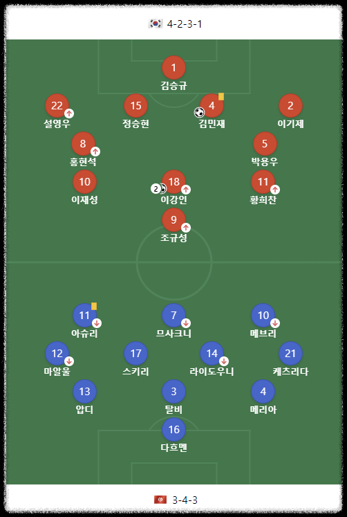 컨디션이 100%가 아닌 손흥민이 선발로 나오지 않으면서 김민재 선수가 주장으로 출전을 하게 되었습니다. 그래서인지 더욱 책임감을 가지고 수비를 하는 모습을 보여주었는데요, 확실히 왜 바이에른 뮌헨에서 주전 수비수로서 활약을 하고 있는지 여실히 보여주는 활약이었습니다. 튀니지의 선수들이 불쌍할 정도의 거친 몸싸움과 수비 실력에 튀니지는 제대로 공격을 하지도 못하는 모습이었습니다. 그리고 빠른 스피드와 패싱 능력으로 대한민국 공격 시에는 하프라인까지 올라오며 수비형 미드필더처럼 뛰는 모습이었습니다. 거기다 세트피스 상황에서 헤딩으로 골까지 넣으면서 왜 세계최고의 수비수 중 한 명인지 다시 한번 확인할 수 있었습니다.