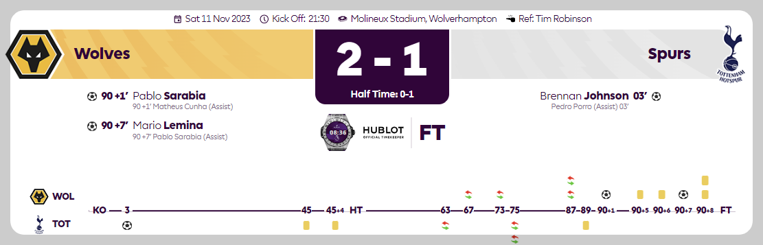 📌 손흥민과 황희찬의 맞대결로 많은 축구팬들의 주목을 모았던 이 경기는 극장골로 울버햄튼이 2 대 1 역전승을 거두었습니다. 하지만 손흥민과 황희찬은 득점이나 도움없이 침묵하고 말았습니다. 토트넘 저번 첼시 경기에 이어 연패에 빠져 2위 자리를 내주었습니다.