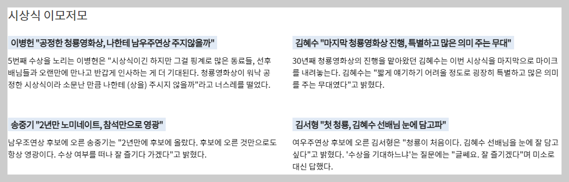 오랜 시간 시상식을 진행하며 때로는 소신 발언으로 묵직한 울림을, 때로는 따뜻한 격려로 응원을 줬던 김혜수인 만큼 배우들도 리스펙트를 표했습니다. '밀수'로 신인여우상을 받은 고민시, 인기스타상을 받은 김혜수, 남우조연상을 받은 조인성, 남우주연상을 받은 이병헌, 최우수 작품상을 받은 외유내강 강혜정 대표 등이 모두 김혜수에게 고마움을 전했습니다.