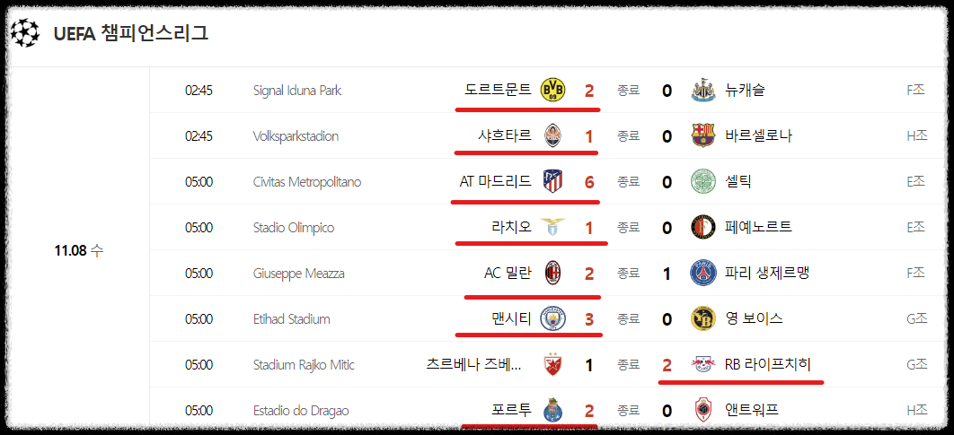 📌 수요일 경기에서는 역시 죽음의 F조답게 도르트문트가 뉴캐슬에 승리하고 AC밀란의 이강인의 PSG를 이겼습니다. 그리고 AT 마드리드는 셀틱을 6 대 0 으로 처참히 무너뜨렸습니다. 맨시티는 또 승리를 거두었습니다. 아래에서 다른 경기까지 확인 가능합니다.