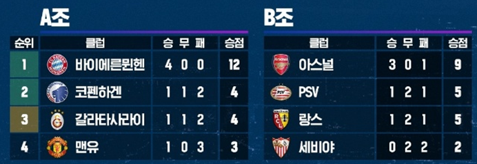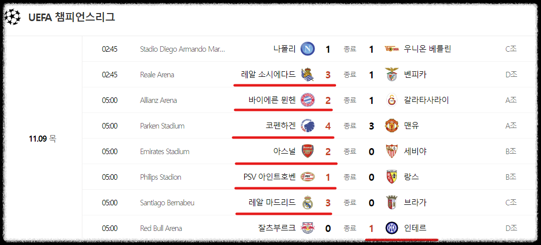 📌 이튿날 목요일 경기에서는 바이에르뮌헨이 갈라타사라이에 승리하며 16강 진출을 이미 확정지었고 맨유는 화이룬의 활약에도 불구하고 코펜하겐에 어이없는 패배를 당하며 16강 진출에 적신호가 켜졌습니다. 아스날은 사카의 활약으로 세비야에 쉽게 승리하였고 벨링엄의 레알 마드리드 역시 브라가에 3 대 0 승리를 거두었습니다. 그 나머지 경기들을 아래에서 다른 경기까지 확인 가능합니다.