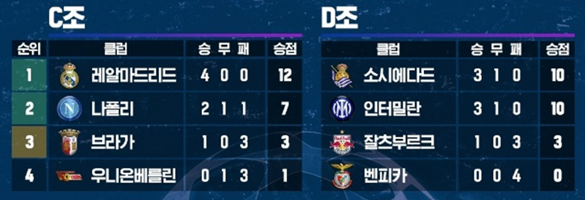📌 조별리그의 남은 매치데이 5, 6경기는 각각 11월 28~29일, 12월 12~13일날 펼쳐집니다. 그 이후에 결선토너먼트가 조추첨이후에 내년 2월 13~14일을 시작으로 시작됩니다.