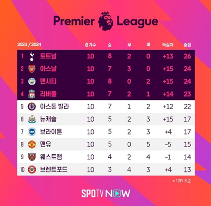 📌 케인 공백으로 약해졌다는 예상을 깨고 손흥민의 리더쉽과 이적생들(메디슨, 바카리오 등)의 엄청난 퍼포먼스로 토트넘이 1위를 달리고 있습니다. 그리고 역시나 그랬듯 맨시티와 아스날, 리버풀이 그 뒤를 쫒고 있는 상황입니다.
