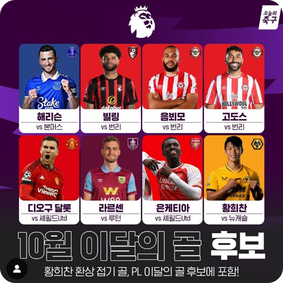 ✅ 황희찬 선수의 뉴캐슬 전 동점골이 10월 이달의 골 후보를 이끌었습니다. 페널티 지역 안쪽에서 자신에게 오는 패스를 원터치로 방향을 바꾸며 수비를 접고 골망을 가른 골이었습니다. 과연 8명의 선수 중에 이달의 골로 선정될 수 있을지 기대됩니다.
