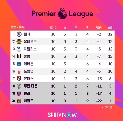 황희찬의 울버햄튼은 12위를 차지하고 있고, 맨유와 첼시가 중위권을 헤매고 있습니다 .