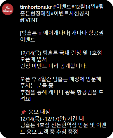 ✅ 캐나다 대표 커피 브랜드 팀홀튼이 한국에 첫 번째 매장을 냅니다. 팀홀튼은 오는 12월14일 강남 신논현점 3번 출구 인근에 팀홀튼 신논현점을 오픈할 예정이며 신논현점은 플래그십 직영 매장으로 운영됩니다.