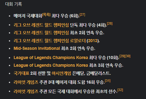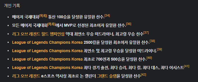 현재 세계 그 누구와 비교하더라도 이 정도의 경력을 가진 리그 오브 레전드 프로게이머는 없으며, 최고의 선수라는 위상에 걸맞게 LoL e스포츠 최고의 대회인 리그 오브 레전드 월드 챔피언십과 4대 메이저 리그 중 하나인 LCK 커리어를 각각 떼어놓고 봐도 독보적인 기록들을 보유하고 있습니다.